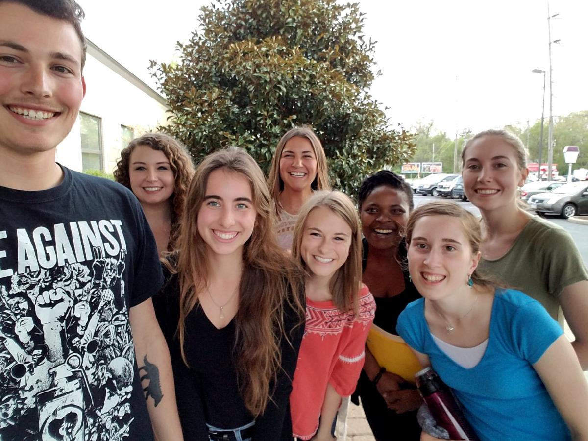 Selfie of about a dozen young people of various races